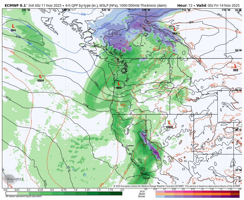 But if the storm stays in Oregon, we even subtract that little bit of wind and it’s just rainy Thursday and Friday. In the lowlands we’re looking at maybe up to an inch of rain or so. Another cooler system races in on that one’s heels later Friday that could do a better job of getting some fresh mountain snow.