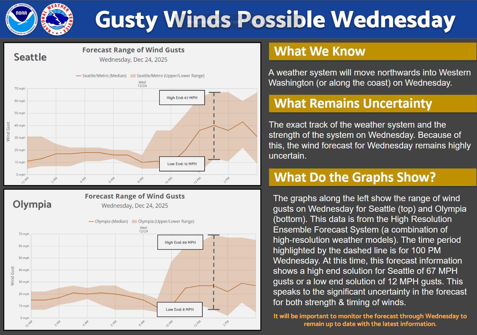 The National Weather Service in Seattle noted in their forecast discussion the high uncertainty but with the wind risk still present, has gone ahead and issued a High Wind Watch for pretty much the entire I-5 corridor including the entire Seattle/Puget Sound Metro area and the coast for Wednesday afternoon (official time of watch: 10 a.m. to 7 p.m.).