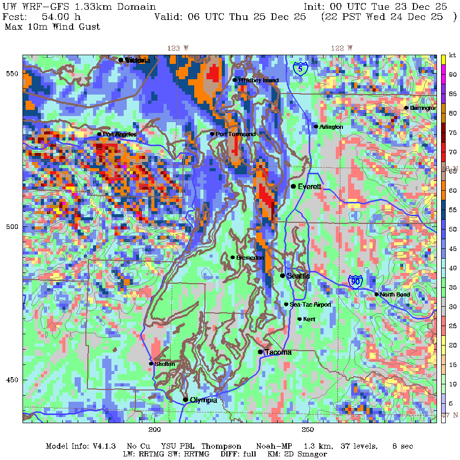 And stay tuned to the forecast, I know that time frame is right in the heart of when local travel may be at its peak for Christmas Eve festivities — I wonder if the more aggressive winds come to pass, ferry runs could be impacted too – even the big runs in the Central Puget Sound.